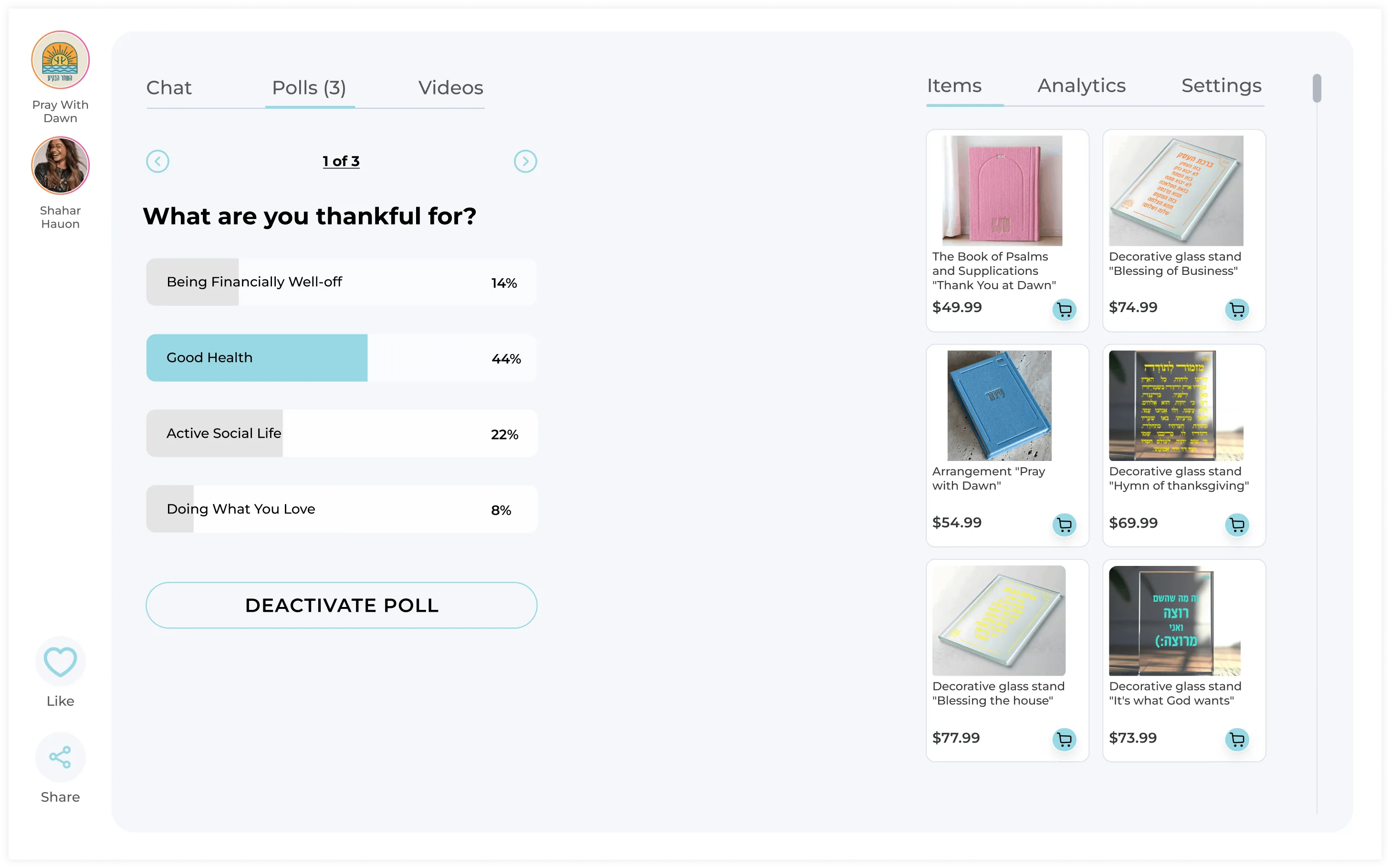 Pray with Dawn, led by founder Shahar Hayun, set out to transform her customer's experience with her one-of-a-kind personalized prayer books. By integrating custom embroidery options and tapping into her strong Instagram following, Shahar partnered with Terrific to create engaging, interactive live shopping events that captivated audiences and drove sales.